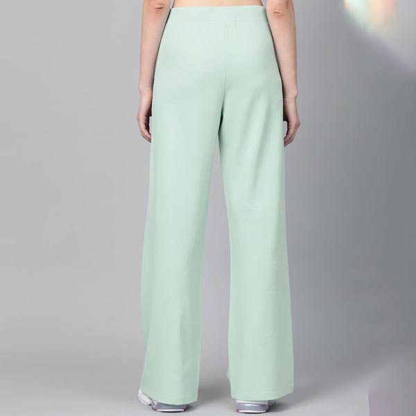 A pair of mint green solid wide leg track pants, has an elasticated waistband with outer drawstring closure